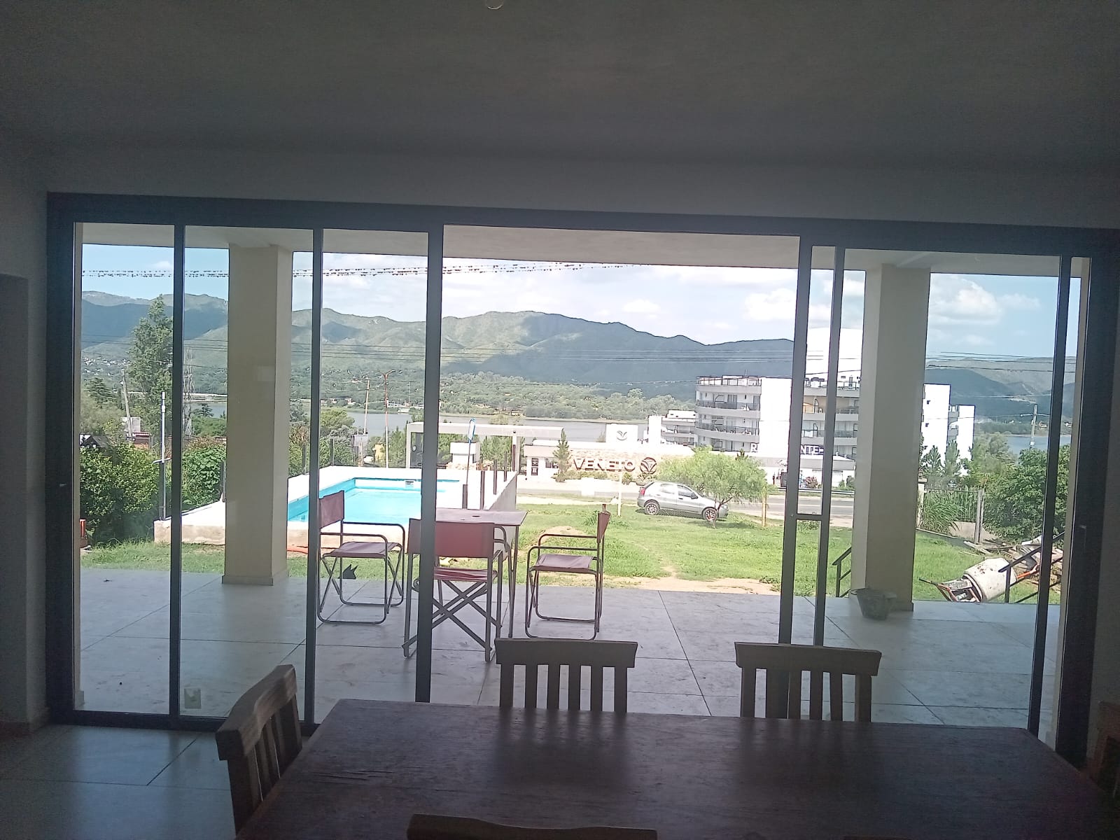 Living comedor cocina, galería cubierta, con hermosa vista al Lago San Roque y a las Sierras.